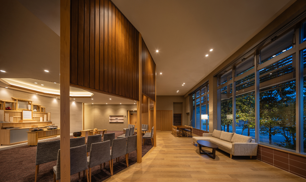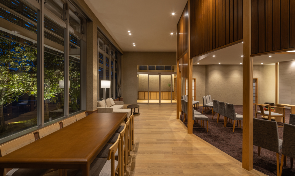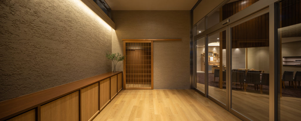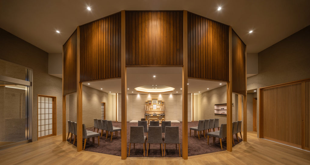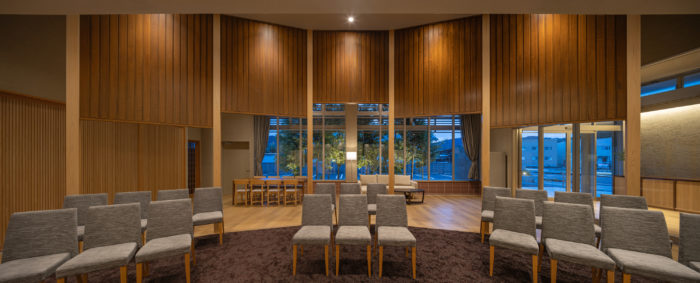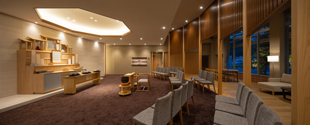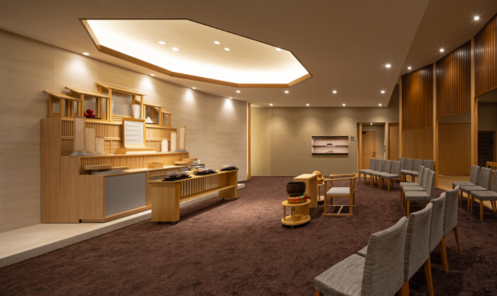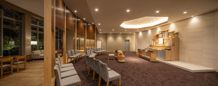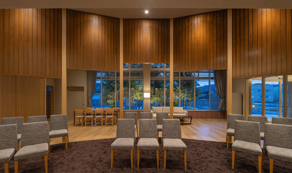 故人を偲び、”最期の時間”を家族みんなでゆったりと過ごせるように、自宅のリビング・ダイニングの延長のような斎場になればと思い、デザインをさせていただきました。